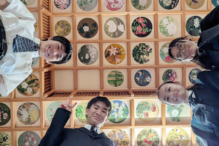 聖徳太子生誕の地である橘寺。目線を変えて天井を見上げると、美しい天井画が!その美しさに見入る生徒たちの姿も見られました。