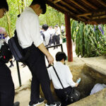 夏といえば、すいか。ジェスチャーを交えながら、外ですいか割を説明。目隠しをしていざ目標のすいかに向かって挑戦。このあと、すいかを割って食べることができました。