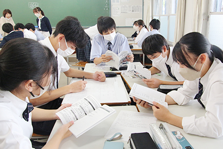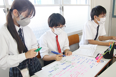 班ごとに分かれてアメリカ研修中の目標を立てていきます。しおりを読み込んで、どのように行動すれば充実した研修旅行になるのかを班で話し合いました。