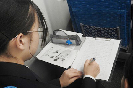 帰りの新幹線では学んだことを紀行文やガイドブックに書き込む生徒の姿がありました。平和の尊さを改めて実感した今回の研修旅行。学びだけで終わらせず、今後の事後学習に生かしていきます。