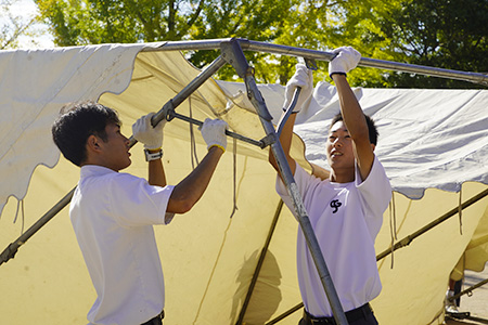 体育祭前日の今日、朝からグラウンドの設営準備を実施しました。生徒と教員で協力して観覧席のテントを組み立てていきます。