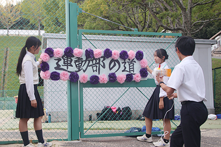 テニスコートには「運動部の道」と称して、各運動部の活動自慢コーナーが作られます。部員たちが作成した模造紙が展示され、各部の魅力が伝わる内容になっています。
