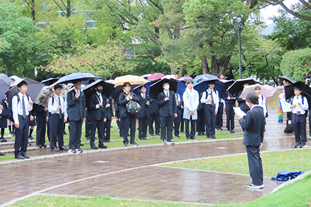 長崎へ到着後は、爆心地公園で平和セレモニーが行われました。代表生徒からの平和の誓いでは、平和の大切さを後世に伝え続ける決意が込められました。