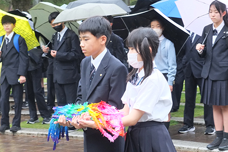 平和セレモニーの最後には学年全員で協力し、心を込めて折った千羽鶴を奉納しました。平和の尊さについて真剣に考える時間になりました。