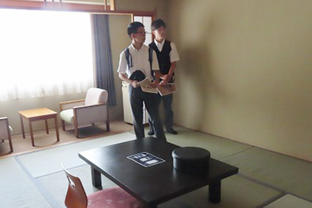 宿泊施設ではお部屋と食事会場も見学させていただきました。入館から食事、出発までの流れを一通り確認し、当日スムーズに行動できるようにします。