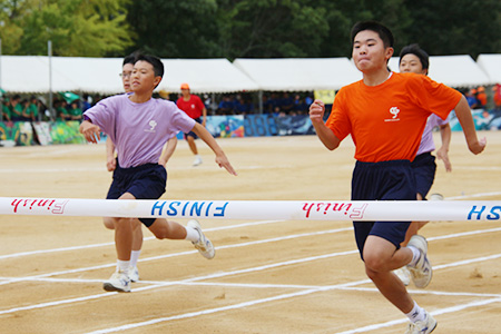 最初の競技は中学生の短距離走。ゴールをめがけて疾走しました!!