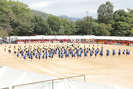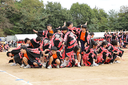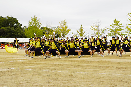 午前の部の最後を飾るのは、6団の応援合戦。どの団も有志たちが朝昼夕と練習を重ねてきました。応援合戦は黄団と青団が同率優勝!黄団は観客を引き込むダンスで一体感を見せました。