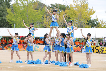 昼休みを挟み、チアリーディング部によるパフォーマンス披露で午後の部の開始です。アクロバティックな技を見せました。