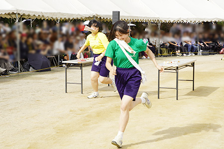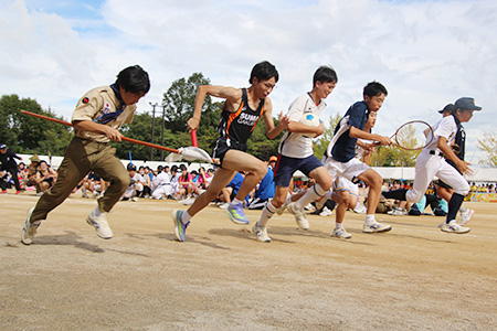 行進のあとは「運動部対抗リレー」。各部活動を象徴するボールやラケットなどをバトン代わりにグラウンドを駆け抜けます。