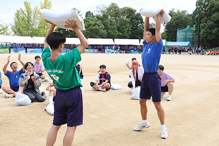 高校男子の「鉄人28号」は力自慢の耐久勝負!!20キロある砂袋を頭上に掲げ、最後まで耐え抜いた選手の勝利。最後まで残った力自慢は!?
