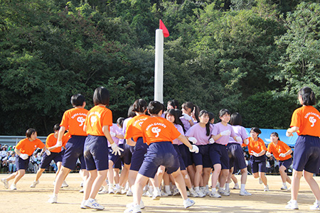 J2(中2)学年による集団行動。音楽に合わせ、学年全員で心を一つにして動きをそろえ、見事な隊形変化を披露しました。