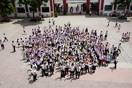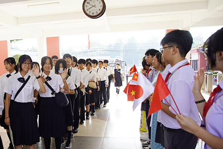 ベトナム、Hoang Hoa Tham校とは今回初めての学校交流となりました。朝8:00に到着すると日本とベトナムの国旗をもった生徒の皆さんがお出迎え。温かく歓迎いただきました。