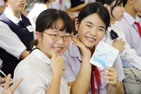 席につくと、さっそくバディとなる生徒同士で贈り物交換。本校生徒からは、手作りの絵をプレゼント。伝統的な顔料を用いて、富士山やもみじ、毬など日本ならではのモチーフを描いた作品を贈りました。