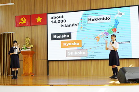 全体交流会では、日本・ベトナムそれぞれの国歌を一緒に歌ったり、お互いの国や学校について紹介をするプレゼンテーションを行いました。J2生はゲーム仕立てでプレゼンし、日本の魅力を楽しく伝えました。