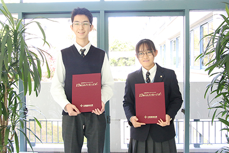 「今までの自分、これからの自分」、「自分にとって海外とは」をテーマにそれぞれのあふれる思いを作品に込めました。3万827作品の応募の中から選ばれ、表彰状を手にしました。