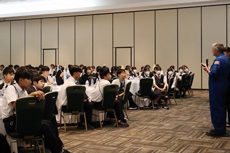 宇宙飛行士の方の講演では、宇宙飛行士になるまでの道のりや初飛行の体験など、貴重なお話を伺いました。質疑応答では次々と手が挙がり、時間いっぱいまで熱心に耳を傾ける生徒の姿が見られました。