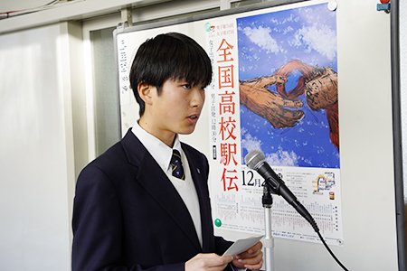 高校生徒会会長からは「全国大会への出場は、みなさんの努力の賜物だと思います。当日は僕たちも現地で応援します。みなさんの力となれるよう精一杯応援します。ぜひ楽しんで走ってきてください。」と応援の言葉をかけました。