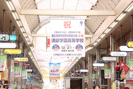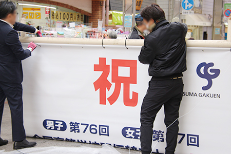 全国高等学校駅伝競走大会へ出場する男子、女子陸上競技部の応援横断幕が、地元・板宿商店街に設置されました。