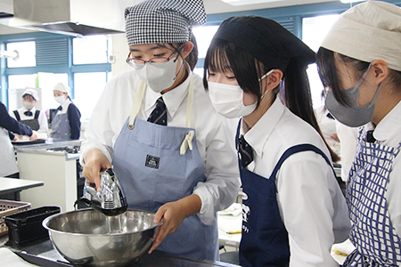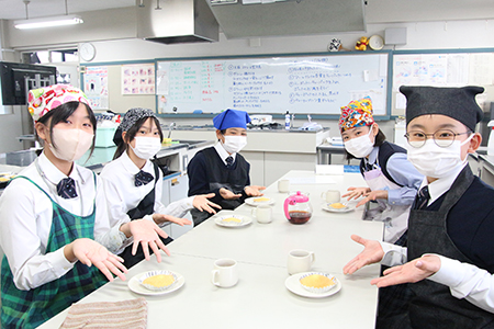 家庭科の時間にJ1(中1)生は初めての調理実習を行いました。調理の間は班のメンバーで役割分担しながら進めていきます。