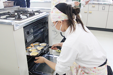 生地を型に流したらオーブンで焼きます。焼き上がったら竹串を刺して焼き加減を確認。甘い美味しそうなにおいが広がってきます。