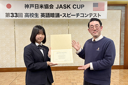 兵庫県下の高校1年生を対象とした、神戸日米協会 第33回高校生英語暗誦・スピーチコンテスト。本校のK1(高1)生も出場し、見事第2位に輝きました!