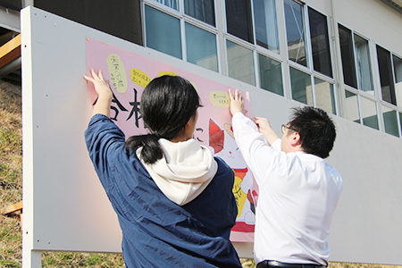 毎年恒例、J1(中1)生による応援ポスターも教員により掲示されました。昨年、先輩たちの応援メッセージに力をもらったJ1生が、今年の受験生に向けてエールを込めて作成しました。