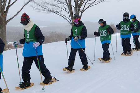 この日、J1生はスノーシュー体験も行いました。スキー靴とは異なる専用の靴に履き替えて出発!森の中を進み、普段は見られない雪の中の自然を観察しました。