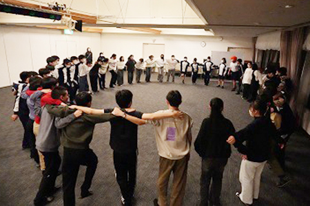 夜にはダンスや劇など、この日のために準備してきたレクリエーションが行われました。始まる前にレク係とスタンツメンバーで円陣を組み、気合を入れます!