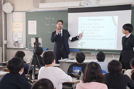 あいさつの大切さということで、英語の授業でも冒頭は、英語でお互いの自己紹介から始めました。須磨学園の英語学習は、「音から始める」がキーワード。正しい発音を理解するため、基本のキとなるアルファベットの発音の仕方も学習しました。
