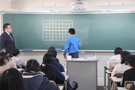 数学の授業では、算数と中学から始まる数学の違いを確認。違いの一つである「論理的に過程を説明する」ことに、数字を使ったパズルで実体験!みんなの前で、論理的な説明にも挑戦しました。