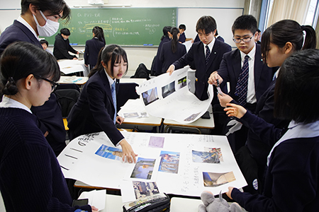 班に分かれ、自分たちで決めたテーマでポスターを作成していきます。現地での学びや調べ学習で集めた情報を、写真やイラストを交えてまとめます。どうレイアウトしたら分かりやすいかな?班員で意見を出し合い鋭意制作中!