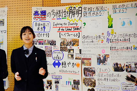 「米国の多様性を解明!!」「「アメリカは誰の国?移民大国のリアル」「ハンバーガーから始まるアメリカの社会問題」…などなど、生徒たちが考えた、アメリカならではの切り口で興味深いテーマが並びました。