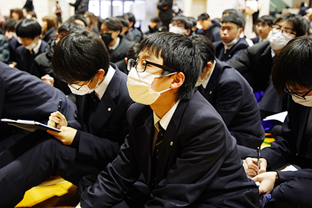 先輩の発表を熱心に聞いていたJ2生たち。来年は自分たちがアメリカへ行く番です。今回先輩たちに教えてもらった視点や気づきは、来年の研修に向けた大切な学びとして積み重ねられていきます。