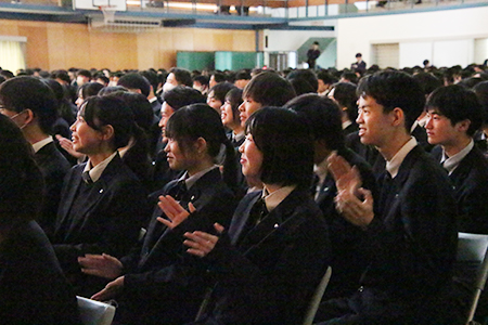 高3生たちに存分に楽しんでもらおうと、高校生徒会の企画・運営のもと、在校生たちは準備を進めてきました。在校生挨拶では、高3生へこれまでの感謝の言葉を贈りました。