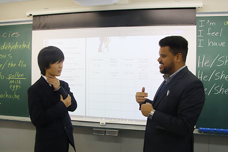 こちらは医者役と患者役に分かれて行う英語での診察。体調についての表現を学びます。どこが痛い、苦しいのか自分で伝えなければ伝わらない究極の場面。ジェスチャーも使いながら、症状を伝える方法を実践しました。