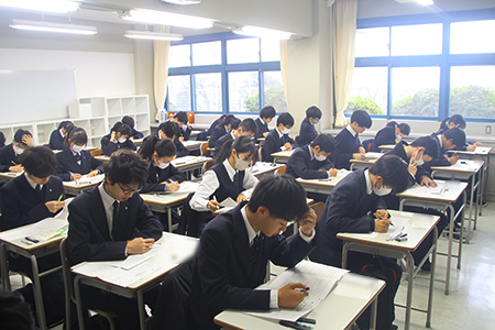 3月25日、高校後期入試とチャレンジ受験(前期入学試験合格者が、希望する類に挑戦する受験)が実施されました。同時に、J2(中2)生も受験生たちと同じ問題に臨みました。