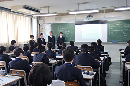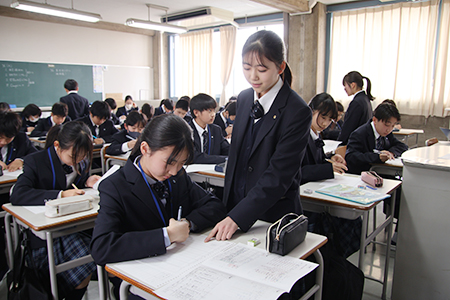 J1学年では、昨年1年PMTMを使いこなしたJ2(中2)学年からPMTMの書き方を学びました。有志の生徒たちが今回のためにつくった、オリジナルのスライドをもとに書き方の参考例を見せながら説明していきました。