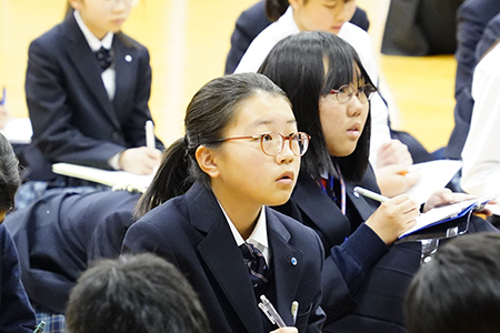 便利なインターネットの世界に潜む危険やリスクをしっかりと理解し、正しく情報を取り扱うために、本校では情報モラル講話を行っています。SNSでのトラブルや炎上、ネット依存の恐ろしさなどについての話を、J1生たちはメモを取りながら真剣に聞いていました。