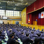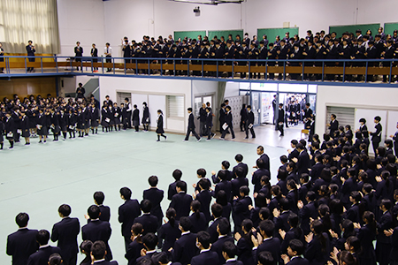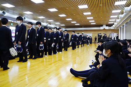 体育館では、高校対面式が行われました。V1・K2(高2)生と、V2・K3(高3)生が拍手で迎えました。S2・K1生が高校生の仲間入りです。