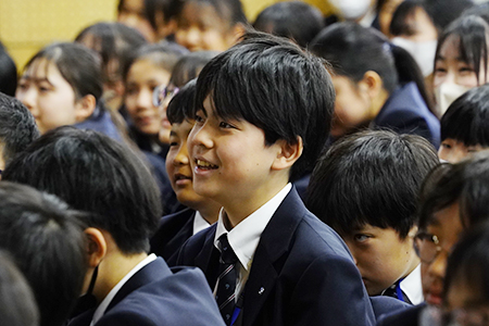 中学対面式は武道館で行われました。緊張の面持ちのJ1生を、あたたかな拍手で迎えるJ2(中2)・S1(中3)生たち。中学生徒会からは、J1の行事についてプレゼンがありました。