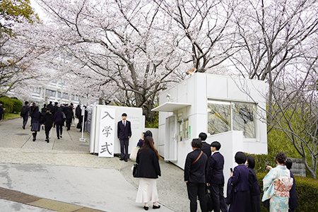 校内の桜が満開を迎え、多くの入学生や保護者が校門で記念撮影をしていました。