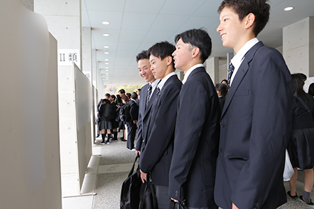 武道館のピロティには、数多くいただいた祝電、祝詞や新クラスの発表が掲示されました。自身のクラスを確認して、新入生は体育館へと進みます。