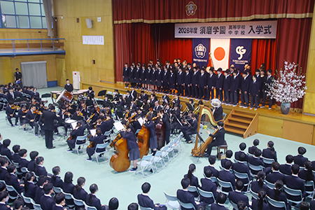 合唱部と在校生有志が須磨学園オーケストラによる演奏で学園歌を歌いました。今月、淡路島で行われるオリエンテーション合宿では、新入生も学園歌の練習を行います。