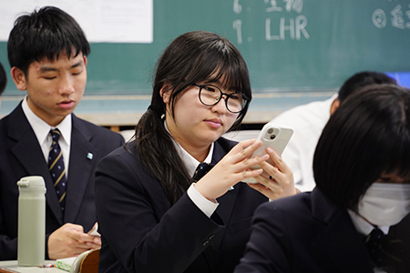 投票は、一人一台配布されている制携帯を使って行われました。J1(中1)・K1(高1)生にとっては初めての生徒会選挙。迷いながらも、候補者への期待を込めて一票を投じていました。